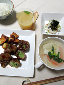 <実習献立> 軽食: 冷やし汁粉&豆乳かん 夕食: 豚肉の大葉、甘酢生姜巻き、 ナスのネギ塩和え、 梅干しとコーンおにぎり、 ミニトマトととろろ昆布の冷やし味噌汁 |