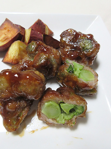 <実習献立> 軽食: 桃缶のゼリー 夕食: ブロッコリーの肉巻き酢豚風・さつま芋の素揚げ添え、 大根の海苔和え、 豆腐とカニカマのすまし汁、 白飯 |