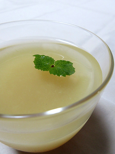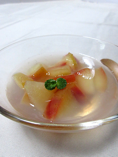 <実習献立> 軽食: 紅茶ゼリー&グレープフルーツジュース 夕食: 小アジの白ワイン蒸し、 豆と夏野菜のカレーマリネ、 ナスの冷たいポタージュ、 フランスパン |