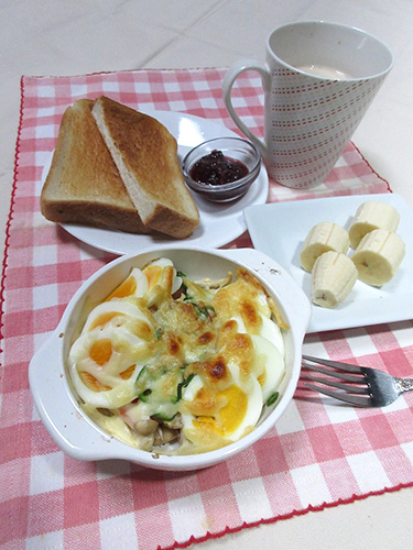 <紹介献立> 朝食: トースト(食パン、チェリージャム)、大豆のチーズ焼き(ゆで大豆、シメジ、トマト、ピーマン、ゆで卵、ピザ用チーズ)、牛乳、バナナ |