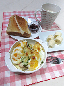 <紹介献立> 朝食: ゆで卵トースト(食パン、ゆで卵、ピザ用チーズ、パセリ)、トマトスープ(トマト、玉ネギ、スイートコーン、グリーンピース、シメジ、コンソメ、トマトケチャップ、コショウ)ヨーグルト・キウイ |