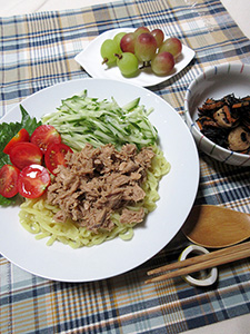 昼食: ツナ缶そぼろ和え麺(中華麺、ツナ水煮缶、オイスターソース、砂糖、しょう油、片栗粉、キュウリ、ミニトマト、青シソ)、ヒジキ煮(米ヒジキ、ニンジン、竹輪、麺つゆ、砂糖)、ブドウ |