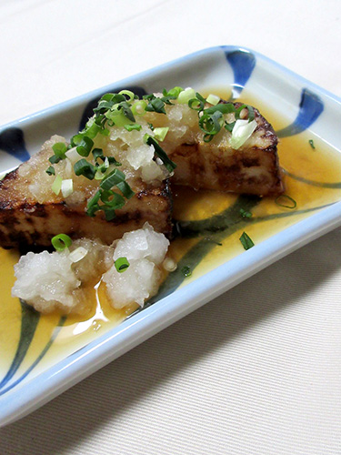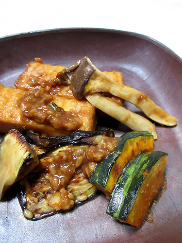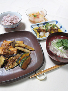 <実習献立> 軽食: リンゴのコロコロゼリー 夕食: 秋野菜と厚揚げのソテー、 大根の揚げだし、 大根とささ身のすまし汁、 十六穀米入りご飯 |