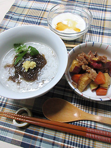 <紹介献立> 朝食: モズク雑炊(ご飯、モズク、生姜)、さつま芋と豚肉の旨煮(さつま芋、豚肉、ニンジン、三温糖、酒、しょう油)、ヨーグルト・はちみつ |