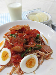 昼食: スパゲティナポリタン(スパゲティ、エノキダケ、トマトケチャップ、トマト缶、コンソメ、塩、ウインナーソーセージ、玉ネギ、ピーマン、ゆで卵)、梨、牛乳 |